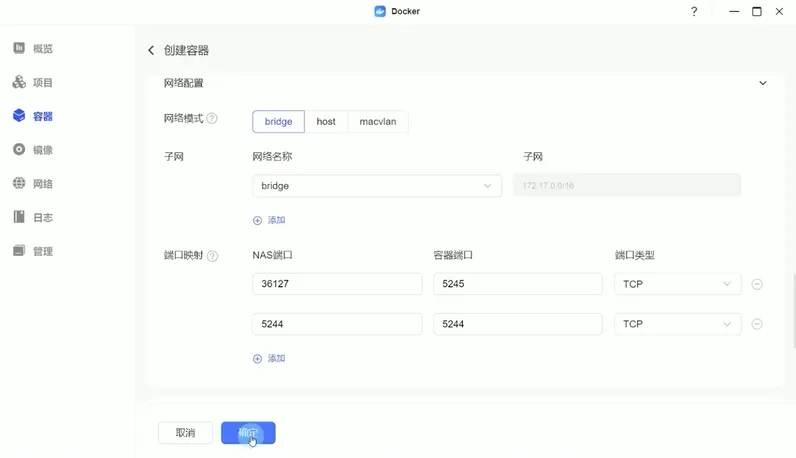 网络配置中保持bridge模式,端口设置为36127:5245,以及5244:5244 (容器端口可以自定义,确保端口不冲突即可)。
