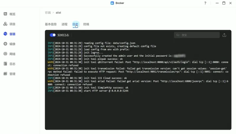 接着访问Alist页面,用户名默认admin,密码获取需要进入容器的控制台,点击日志找到password字符,复制到Alist登录界面即可。