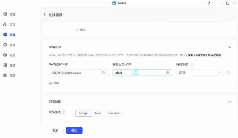 存储空间中NAS目录设置为共享文件夹/docker/xiaoya,容器目录设置为/data,容器权限保持读写。