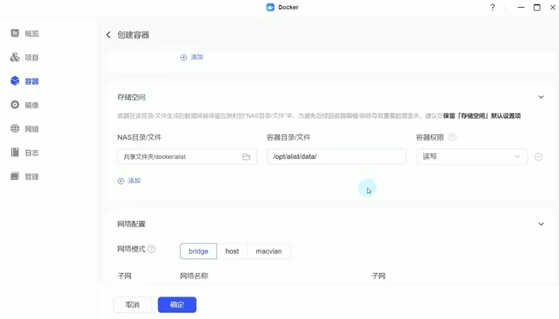 存储空间中,NAS目录设置为共享文件夹/docker/alist,容器目录设置为/opt/alist/data/,容器权限保持读写。