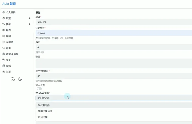 选择Alist V3,挂载路径输入/xiaoya,WebDAV选择本地代理。
