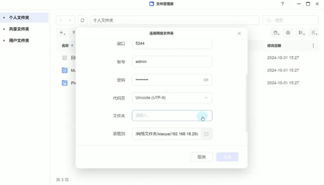 在绿联云的文件管理器中,点击左上角+号,选择连接网络文件夹,ip输入NAS的IP地址,连接协议选择WebDAV,端口号5244,账号与密码输入Alist登录的信息。