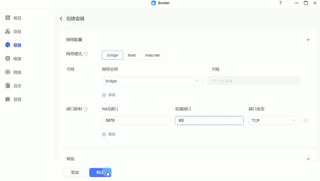网络保持bridge,NAS端口5678,容器端口80(容器端口可以自定义,确保端口不冲突即可),最后点击确定。