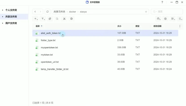 接着进入绿联云的文件管理器——共享文件夹——docker文件夹,新建xiaoya与alist子文件夹,点击打开xiaoya文件夹,拖拽上传刚才新建的三个桌面文本文档。