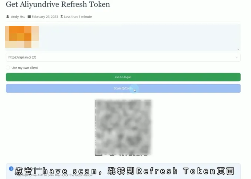 再进入该网址https://alist.nn.ci/tool/aliyundrive/request,选择Scan QrCode,用手机阿里云盘扫码。