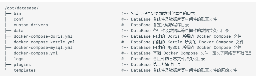 安装脚本使用 /opt/dataease 作为默认安装目录,所有配置文件、数据及日志等均存放在该安装目录。