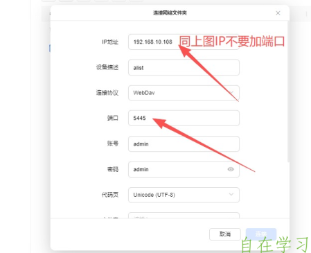 我们新建网络文件夹,输入刚才那个IP,端口改成刚才那个端口