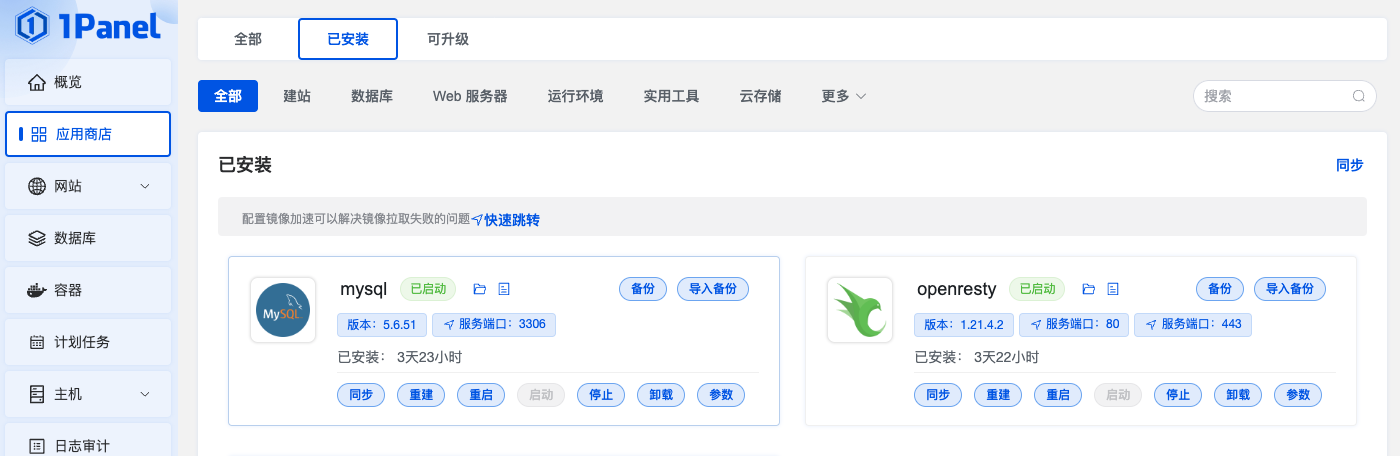 在安装 emlog 之前,需要先在 1Panel 的应用商店里安装好所需的软件,包括 OpenResty 和 MySQL。