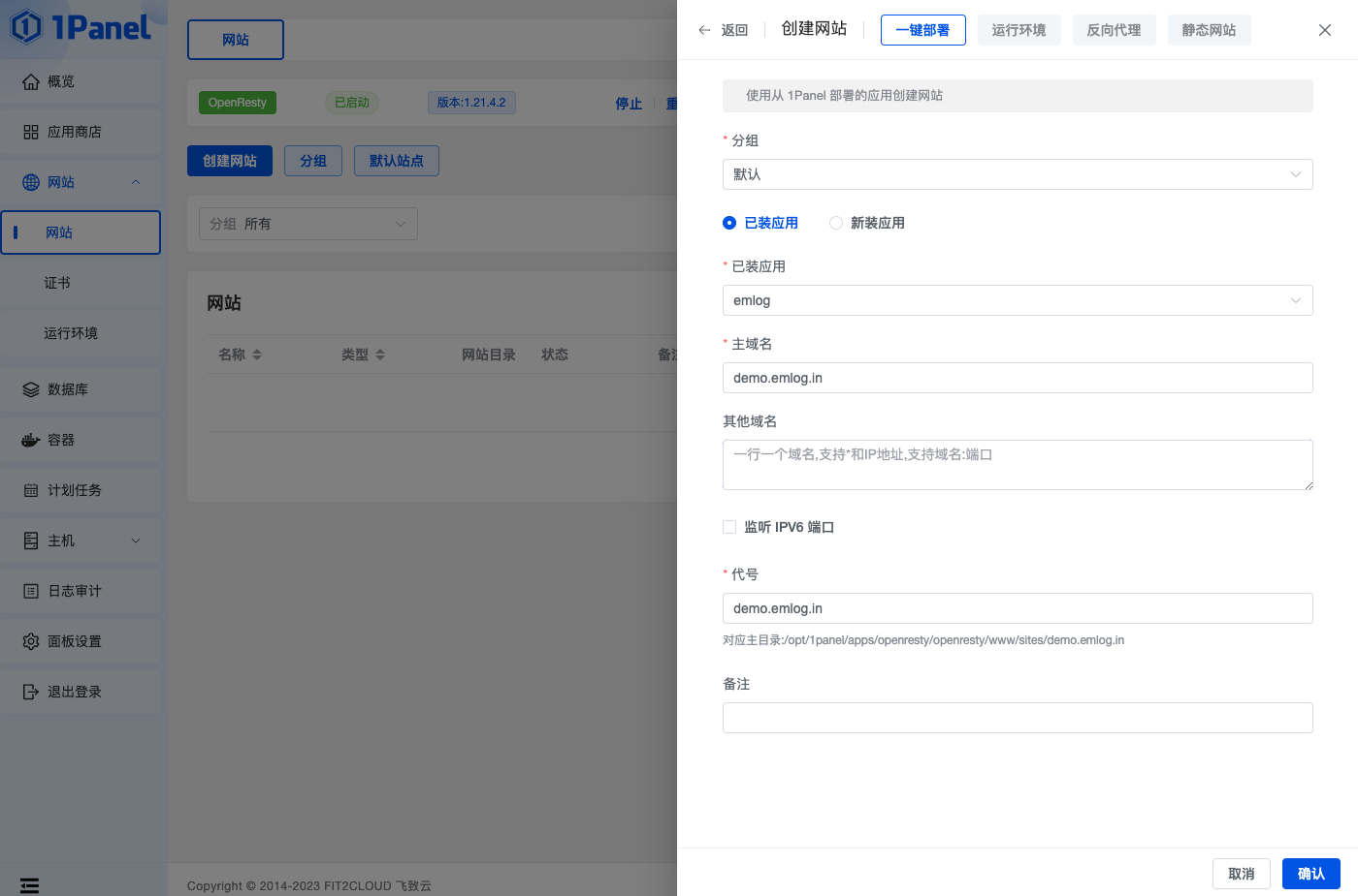 完成 emlog 应用的安装后,此时并不会自动创建一个网站,我们需要手动创建一个网站,然后将 emlog 应用绑定到这个网站上才能使用域名访问。