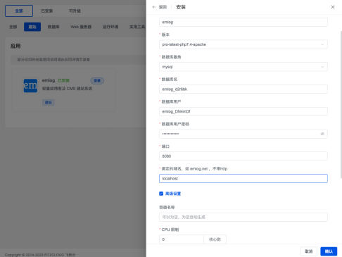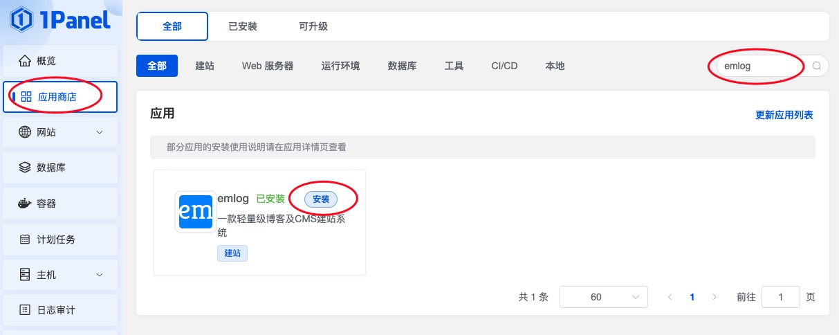 应用商店搜索安装 emlog:左侧菜单打开【应用商店】 右上角输入:emlog 点击搜索