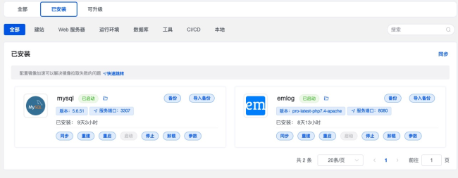 点击确认安装后,就开始进入安装流程,等待一会emlog的应用状态变为 已启动状态,如下图状态