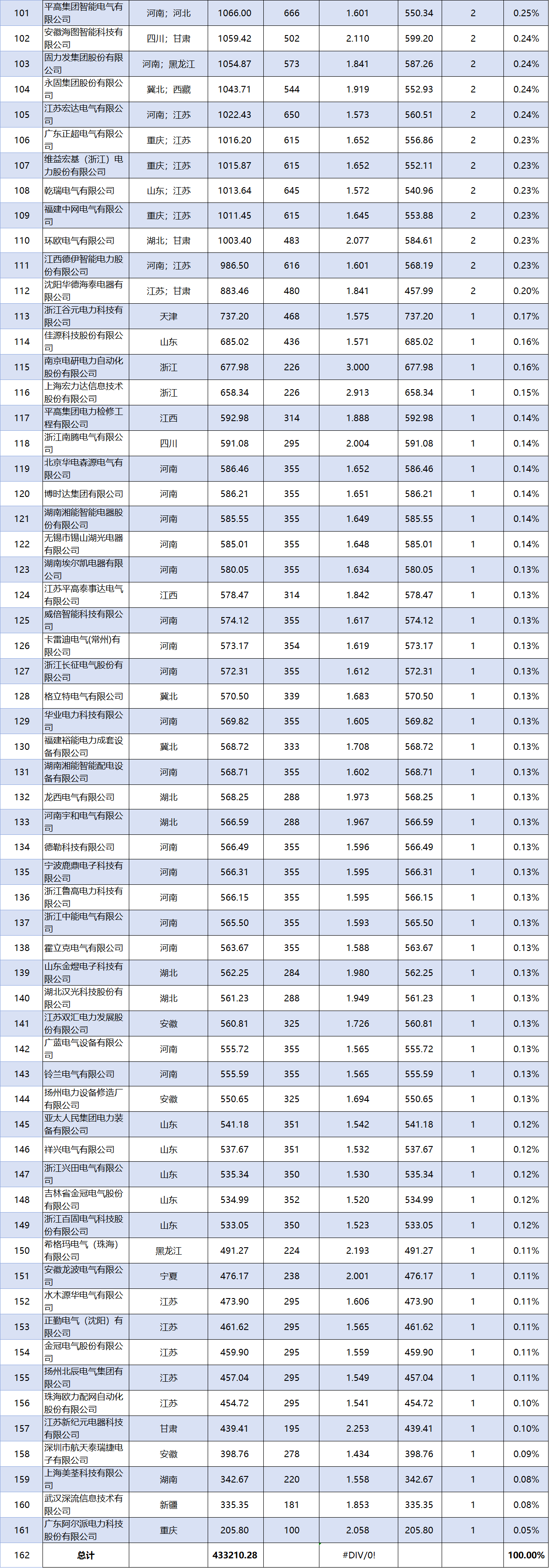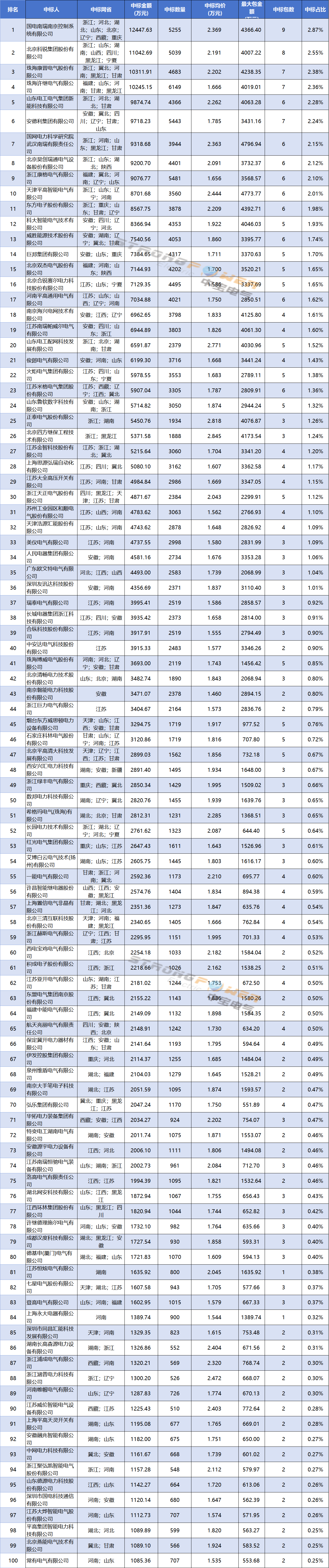 此次中标厂家总计161家,平均中标金额约2690万,中标过亿的有4家,超5000万的有9家,过千万的110家