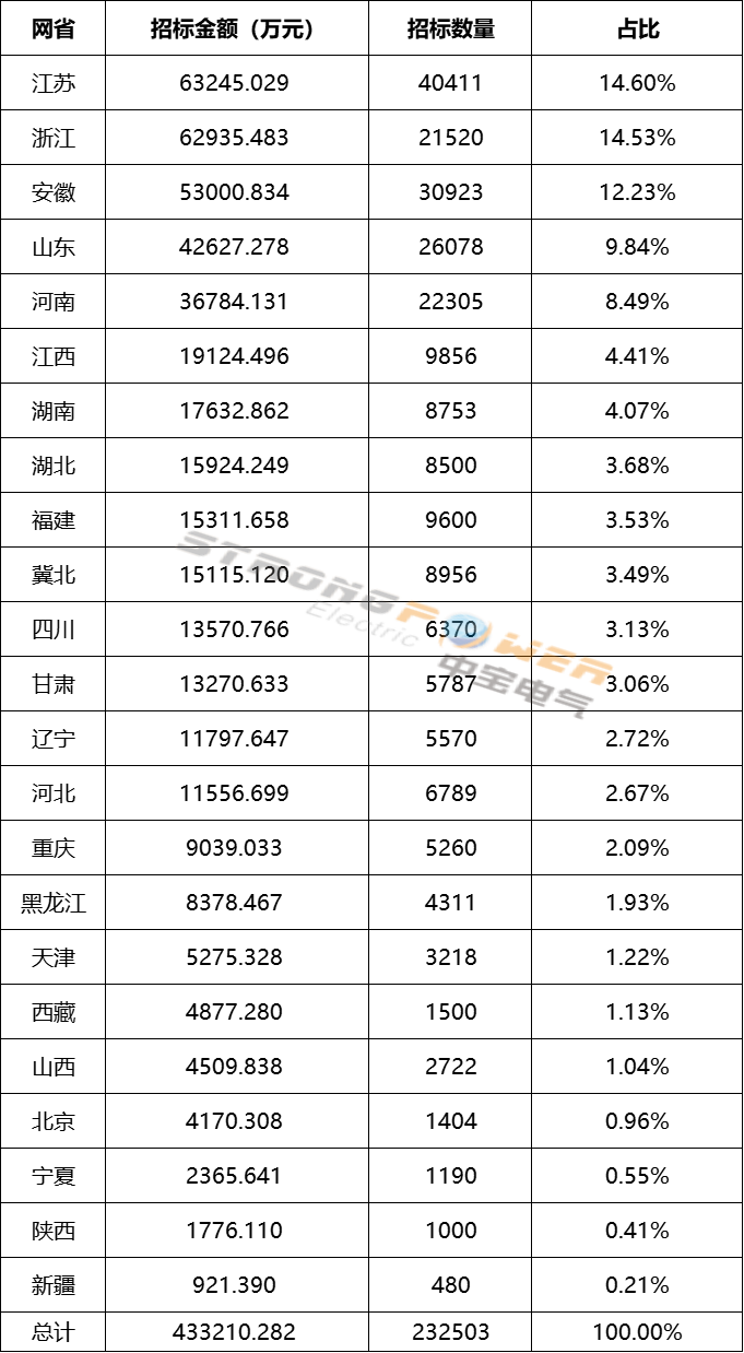 从各网省来看招标最多的还是江浙地区,安徽的用量也比较大,前三网省加起来占比超过了40%。
